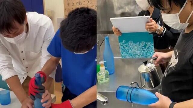 奄美の黒糖焼酎「れんと」の美しいブルーのリターナブル瓶を、奄美の障がい者福祉サービス事業所「あしたば園」の皆様にカットしていただき、容器を作っています。