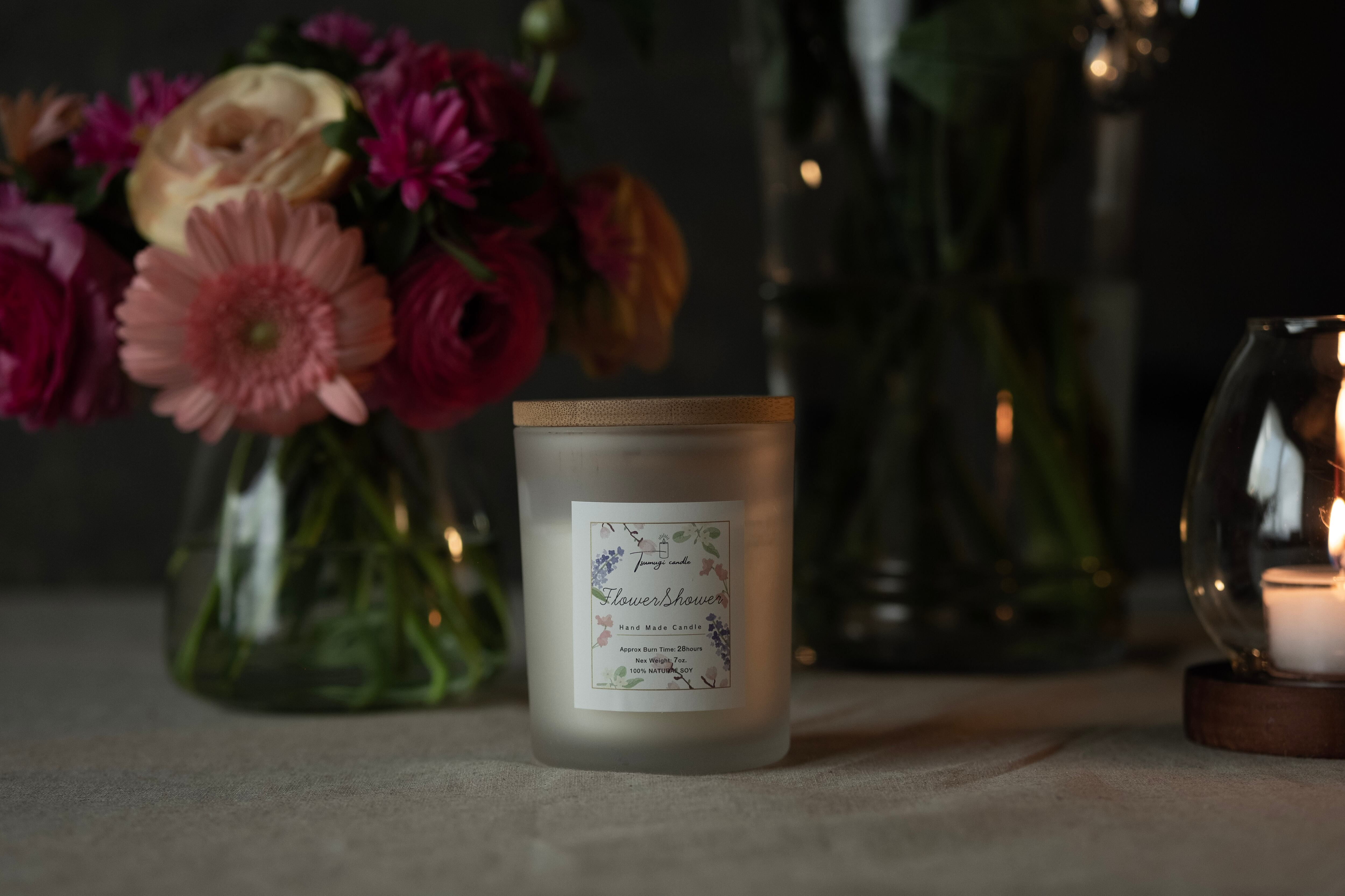 フラワーシャワーは、遺伝子組み換えのない環境に配慮した天然の大豆を使用して作られたキャンドルです。